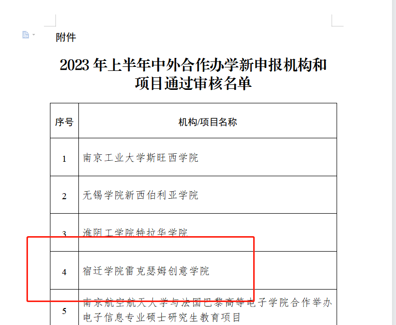 日前,江苏省教育厅公布了2023年上半年中外合作办学新申报机构和项目审核结果,我校申报的宿迁学院雷克瑟姆创意学院通过省教育厅审核并予以公示,这是迄今为止我校通过审核的第一个中外合作办学机构。