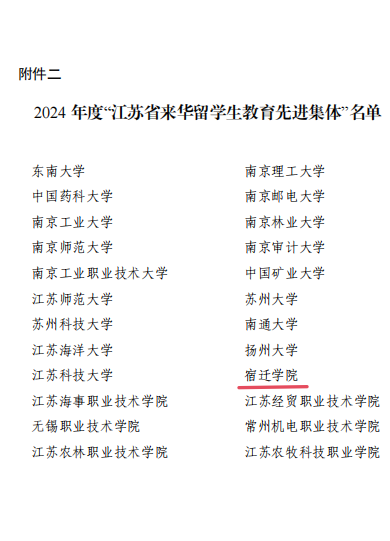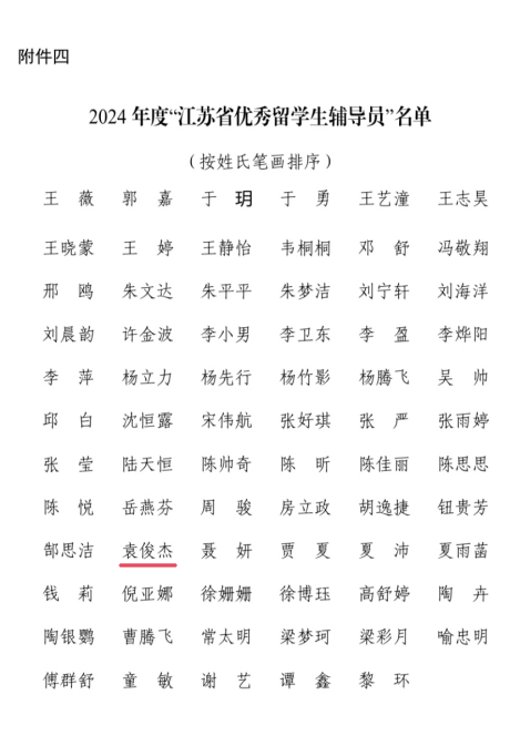 日前,江苏省高等教育学会外国留学生教育研究委员会公布2024年度“江苏省来华留学生教育先进集体”“江苏省优秀留学生辅导员”评选结果,我校荣获2024年度“江苏省来华留学生教育先进集体”,是我校首次获得此项荣誉。同时,国际教育学院袁俊杰老师荣获2024年度“江苏省优秀留学生辅导员”称号。